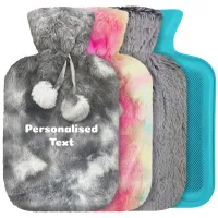 Personalised Hot Water Bottle Cover with Printed Design allowing you to add your own personalised text on the front, printed to a luxury soft velvet polyester fabric. Comes with a free bottle in the size selected.